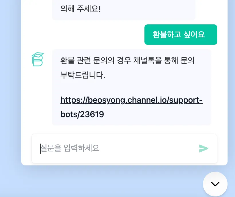 환불 관련 문의의 경우 채널톡(인간 상담사)으로 연결