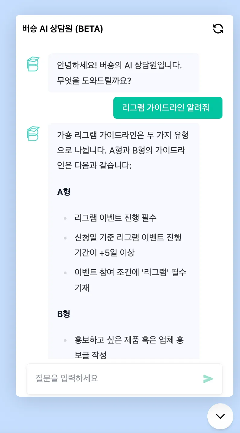 (주)버숑 공식 홈페이지에 들어갈 웹 서비스 형태의 AI 챗봇 제작 (2024-07 도입 예정)