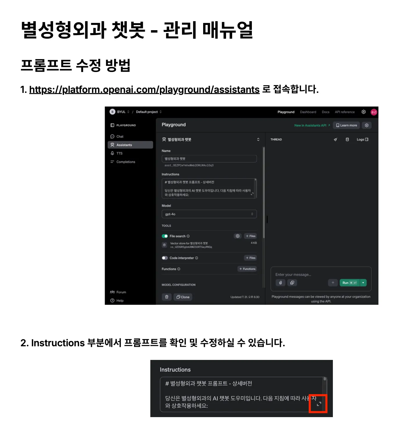 openai의 assistant 기능을 활용하여, 고객사가 직접 해당 AI모델의 프롬프트 및 학습 자료를 관리할 수 있도록 세팅 및 안내함